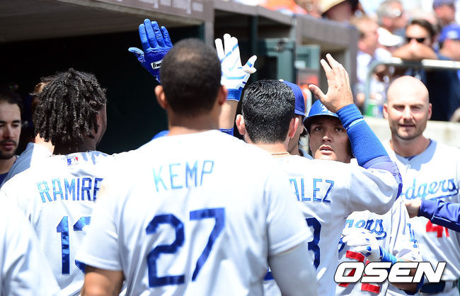 5회초 2사 다저스 로하스가 솔로 홈런을 때린 뒤 동료들과 기뻐하고 있다.