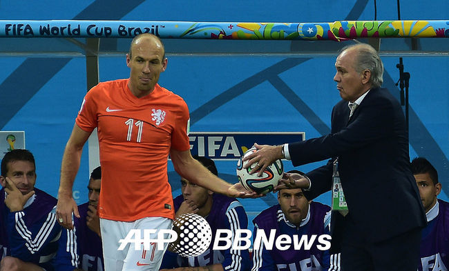 전반 아르헨티나 사베야 감독이 네덜란드 로벤에게 공을 건네고 있다.