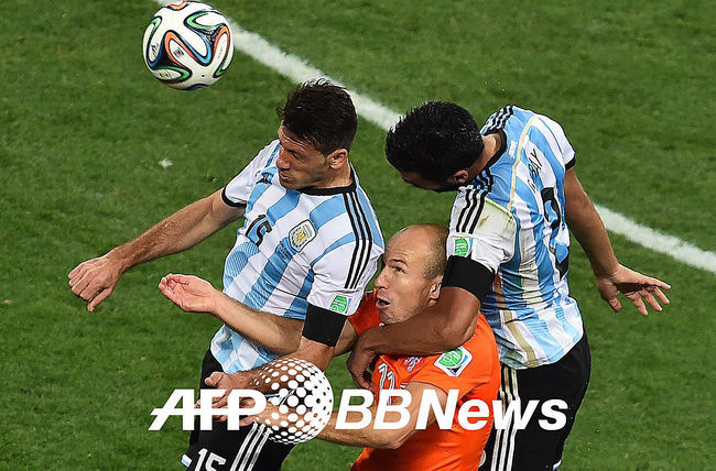 네덜란드 로벤이 아르헨티나 가라이와 데미첼리스의 헤딩경합에 막히고 있다.