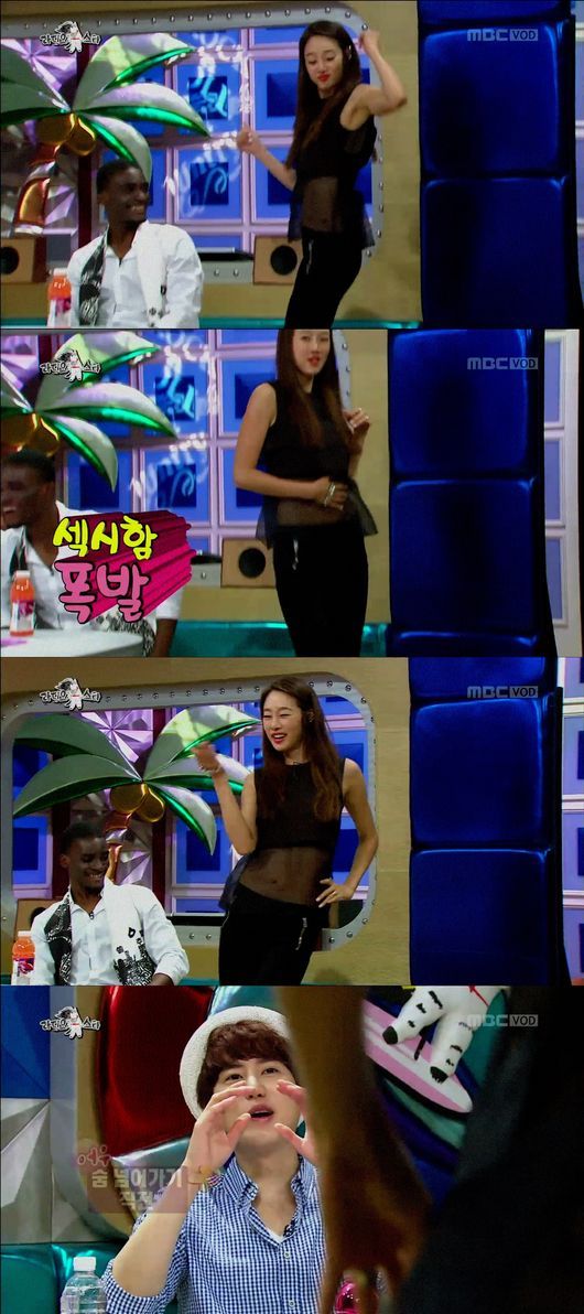 ‘라디오스타’에 출연한 배우 최여진이 시스루룩을 입고 화끈한 클럽댄스를 선보였다.
