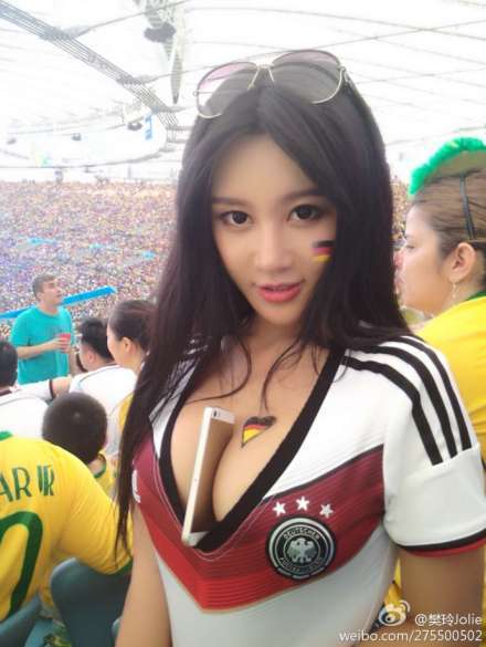 판링은 지난 5일 자신의 웨이보를 통해 2014 브라질 월드컵의 독일-브라질 경기에서 응원을 펼치는 몇 장의 사진을 게재했다.