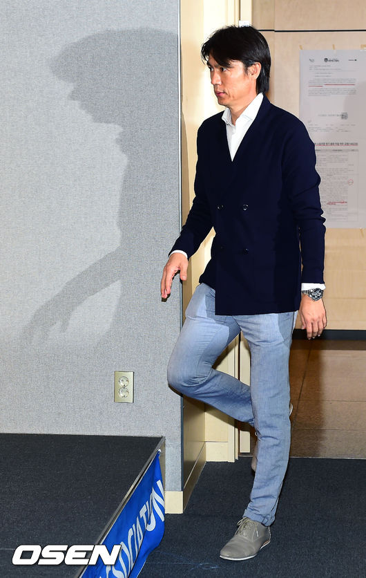 홍명보 감독이 기자회견 장소로 들어서고 있다.