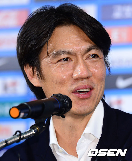 홍명보 감독이 옅은 미소를 지으며 질의응답을 하고 있다.