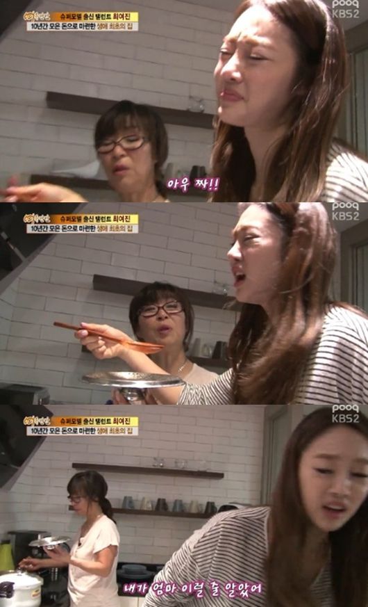 하지만 엄마의 찌개 맛을 본 최여진은 "너무 짜다. 이럴 줄 알았다. 하나도 안 늘었다"고 타박해 엄마를 서운하게 했다.