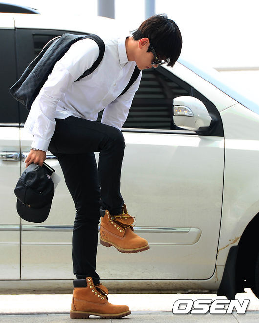 엑소 백현이 차에서 내려 신발 끈을 정리하고 있다.