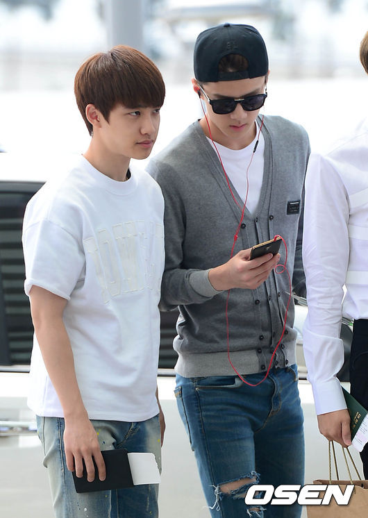 엑소 디오와 세훈이 차에서 내려 신호를 기다리고 있다.