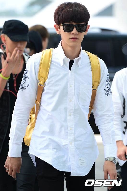 엑소 찬열이 공항 입장을 위해 횡단보도를 건너고 있다.