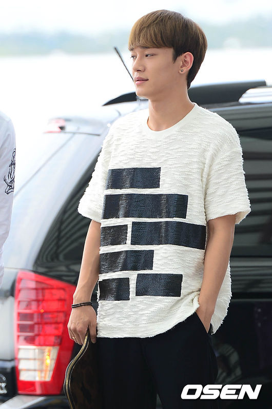 엑소 첸이 공항 입장을 위해 신호를 기다리고 있다.
