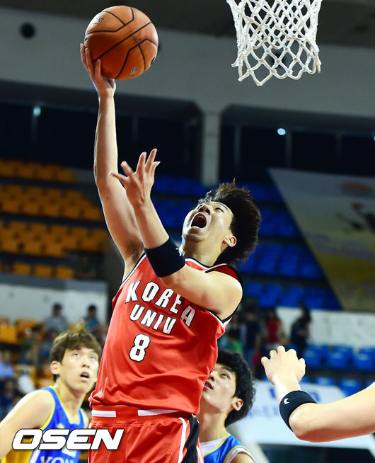 1쿼터, 고려대 김지후가 골밑슛을 하고 있다.