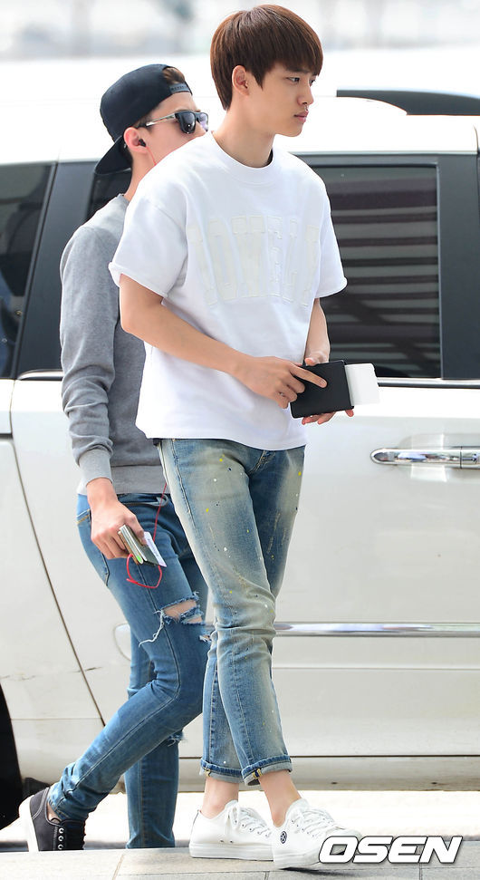 엑소 디오가 차에서 내려 공항 입장을 위해 신호를 기다리고 있다.