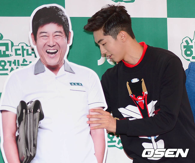 학교다녀오겠습니다 제작발표회에 앞서 포토타임중 모델 남주혁이 성동일 브로마이드 사진을 옮기고 있다.
