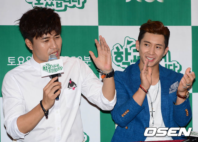 학교다녀오겠습니다 제작발표회중 김종민의 말에 브라이언이 박수치며 공감하고 있다.