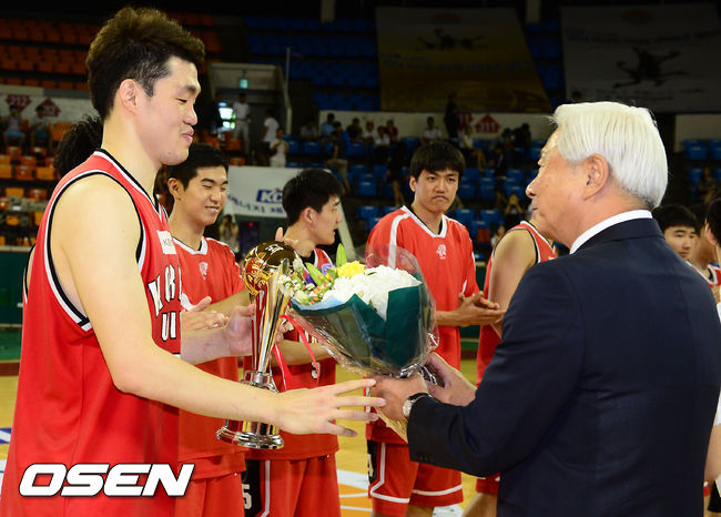 경기종료 후, 우승한 고려대 이승현이 방열 대한농구협회장으로 부터 트로피를 건네 받고 있다. /ouxou@osen.co.kr