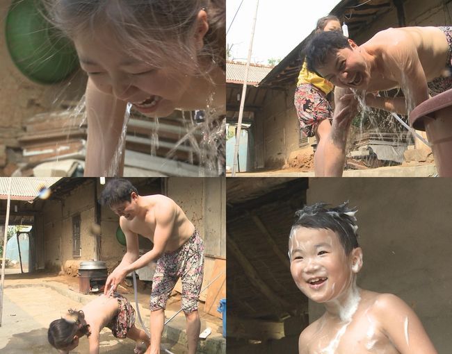 정웅인과 딸 세윤이 서로 등목을 해주며 시원한 기분을 느끼는 사진과 등목을 하다가 아예 온몸에 비누칠하며 샤워하고 있는 윤후의 귀여운 모습 역시 눈길을 끈다.