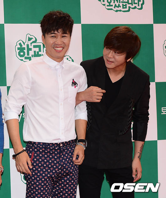 학교다녀오겠습니다 제작발표회에 앞서 김종민과 윤도현이 포토타임을 갖고 있다.