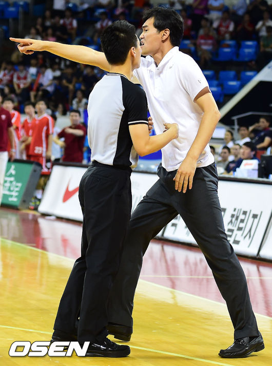 연장전 종료 2분을 남기고 초유의 사태가 발생했다. 최준용의 골밑슛을 시도하는 과정에서 이승현이 수비를 했다. 파울이라고 생각한 정재근 감독은 흥분을 참지 못하고 심판을 때리려는 제스처를 취했다. 이어 코트에 난입한 정 감독은 직접 파울을 분 다른 심판에게 다가가 그를 머리로 들이 받았다. 경기가 진행되는 와중이었다.