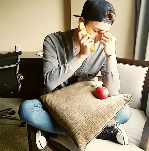사진 속 세훈은 의자에 앉아 바나나를 귀에 대고 진지한 포즈를 취하고 있다. 또한 무릎 위에 놓은 사과까지 깨알 같은 재미를 선사해 눈길을 끌었다.