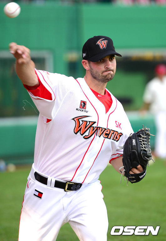 10일 오후 인천 문학구장에서 열리는 '2014 한국야쿠르트 세븐 프로야구' SK 와이번스와 KIA 타이거즈의 경기 시작전 SK 새 용병 트래비스 밴와트가 피칭 포즈를 취하고 있다.
