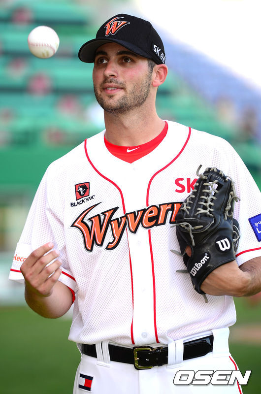 10일 오후 인천 문학구장에서 열리는 '2014 한국야쿠르트 세븐 프로야구' SK 와이번스와 KIA 타이거즈의 경기 시작전 SK 새 용병 트래비스 밴와트가 포즈를 취하고 있다.