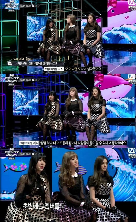 오렌지캬라멜의 리지는 10일 오후 방송된 Mnet '엠카운트다운'에서 이 같이 말하며 "앨범 하나 내고 조용히 접거나, 사람들이 좋아할 수 있다고 생각했다"고 밝혔다.
