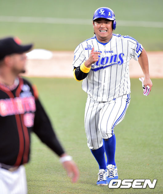 10일 오후 대구구장에서 열린 2014 한국야쿠르트 세븐 프로야구 삼성 라이온스와 롯데 자이언츠의 경기, 2회말 무사 1루 삼성 이승엽의 외야플라이때 1루 주자 박석민이 1루로 귀루하고 있다.