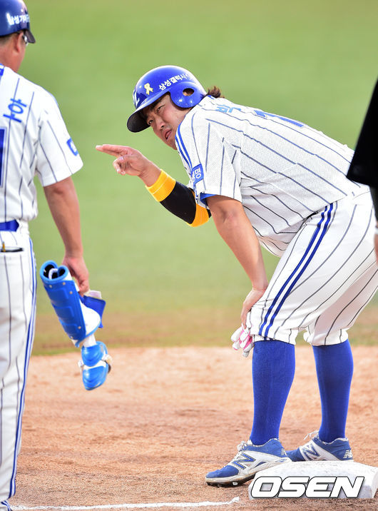 10일 오후 대구구장에서 열린 2014 한국야쿠르트 세븐 프로야구 삼성 라이온스와 롯데 자이언츠의 경기, 2회말 무사 1루 삼성 이승엽의 외야플라이때 1루 주자 박석민이 1루로 귀루 후 김평호 코치와 이야기를 나누고 있다.