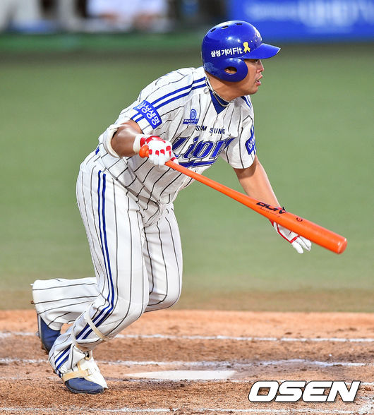 10일 오후 대구구장에서 열린 2014 한국야쿠르트 세븐 프로야구 삼성 라이온스와 롯데 자이언츠의 경기, 3회말 1사 2루 삼성 박한이가 선취 1타점 적시타를 날리고 있다