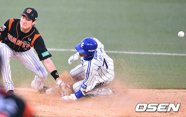 10일 오후 대구구장에서 열린 2014 한국야쿠르트 세븐 프로야구 삼성 라이온스와 롯데 자이언츠의 경기, 3회말 1사 1루 삼성 박한이의 타석때 1루 주자 김상수가 도루성공하고 있다.