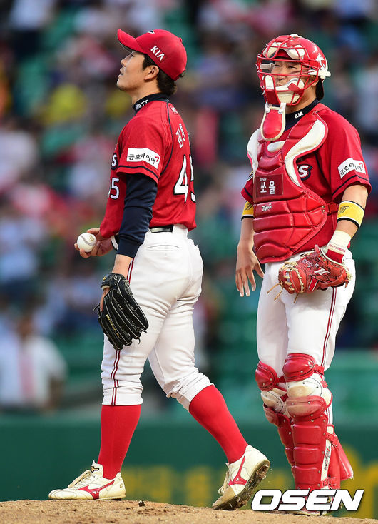 10일 오후 인천 문학구장에서 열린 '2014 한국야쿠르트 세븐 프로야구' SK 와이번스와 KIA 타이거즈의 경기 3회말 1사 1,3루 이재원에게 1타점 2루타를 허용한 김병현이 아쉬운 표정을 지으며 마운드에 서 있다.
