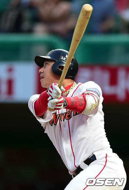 10일 오후 인천 문학구장에서 열린 '2014 한국야쿠르트 세븐 프로야구' SK 와이번스와 KIA 타이거즈의 경기 3회말 1사 2,3루 김강민이 희생플라이를 치고 있다.