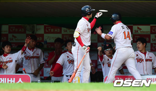 10일 오후 인천 문학구장에서 열린 '2014 한국야쿠르트 세븐 프로야구' SK 와이번스와 KIA 타이거즈의 경기 3회말 1사 2,3루 김강민의 희생플라이에 득점한 3루주자 최정이 덕아웃에서 동료들과 하이파이브를 하고 있다.