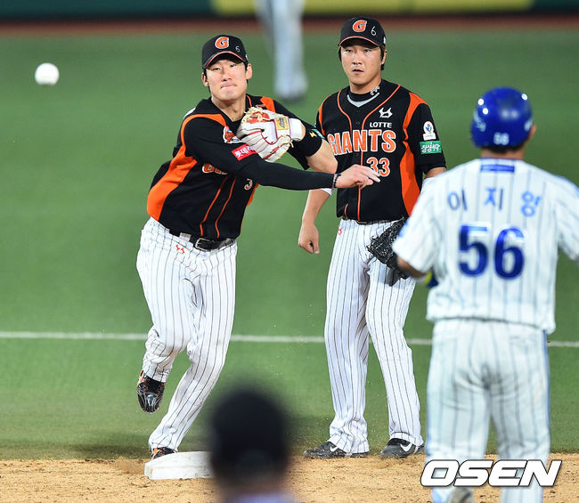 10일 오후 대구구장에서 열린 2014 한국야쿠르트 세븐 프로야구 삼성 라이온스와 롯데 자이언츠의 경기, 4회말 1사 1루 삼성 김상수의 병살타때 롯데 오승택 유격수가 1루 주자 이지영을 포스아웃 시킨뒤 1루로 송구하고 있다.