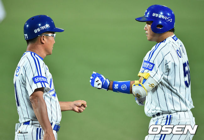 10일 오후 대구구장에서 열린 2014 한국야쿠르트 세븐 프로야구 삼성 라이온스와 롯데 자이언츠의 경기, 4회말 1사 3루 삼성 이지영이 1타점 적시타를 날리고 김평호 코치와 하이파이브를 하고 있다
