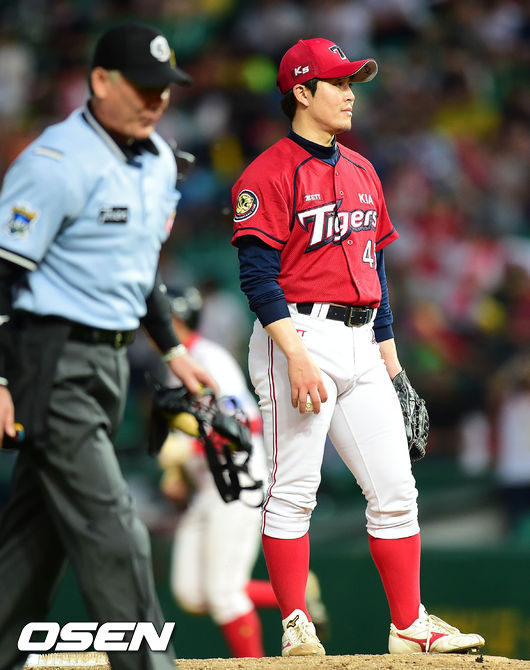 10일 오후 인천 문학구장에서 열린 '2014 한국야쿠르트 세븐 프로야구' SK 와이번스와 KIA 타이거즈의 경기 4회말 2사 1,2루 김병현이 피칭 보크를 범하고 마운드에 서 있다.