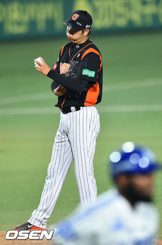 10일 오후 대구구장에서 열린 2014 한국야쿠르트 세븐 프로야구 삼성 라이온스와 롯데 자이언츠의 경기, 5회말 롯데 장원준 선발투수가 삼성 나바로에게 볼넷을 허용한 후 아쉬워하고 있다