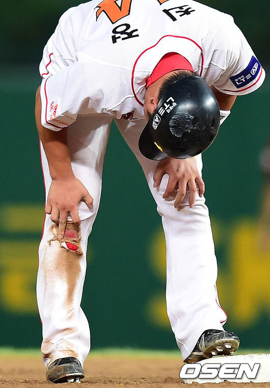 10일 오후 인천 문학구장에서 열린 '2014 한국야쿠르트 세븐 프로야구' SK 와이번스와 KIA 타이거즈의 경기 5회말 1사 1루 김강민 타석, 1루주자 최정이 도루에 성공하고 상처가 난 무릎을 바라보고 있다.
