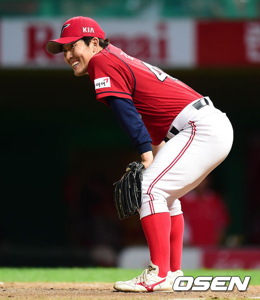10일 오후 인천 문학구장에서 열린 '2014 한국야쿠르트 세븐 프로야구' SK 와이번스와 KIA 타이거즈의 경기 5회말 2사 3루 박정권의 타석, 김병현이 폭투 후 동점 득점까지 허용하자 아쉬운 미소를 짓고 있다.