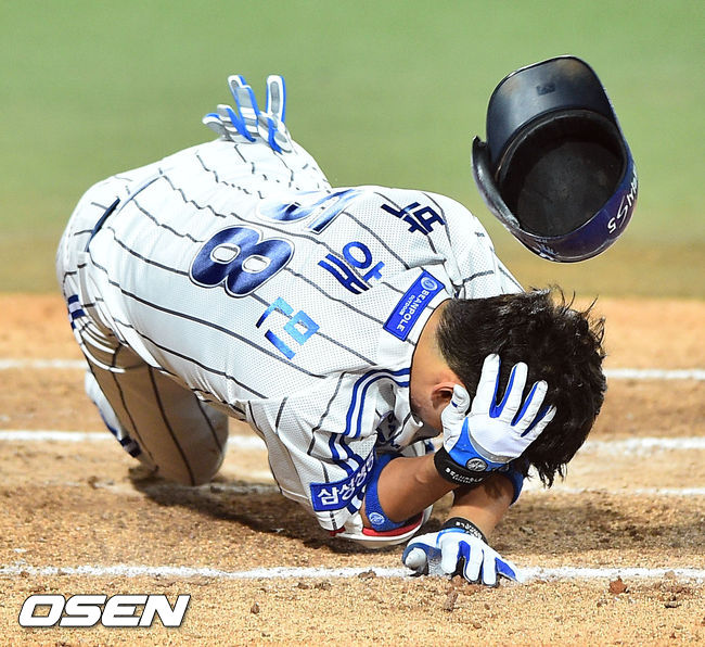 10일 오후 대구구장에서 열린 2014 한국야쿠르트 세븐 프로야구 삼성 라이온스와 롯데 자이언츠의 경기, 6회말 1사 1루 삼성 박해민이 롯데 장원준의 투구에 맞고 쓰러지고 있다.