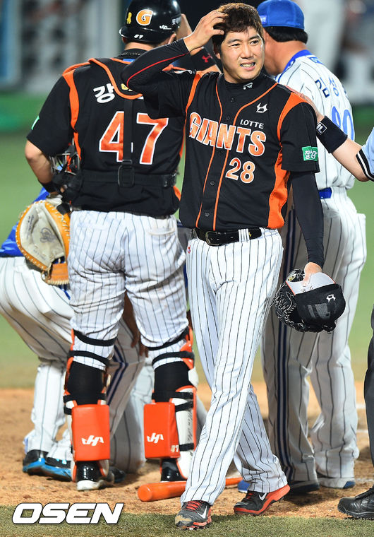 10일 오후 대구구장에서 열린 2014 한국야쿠르트 세븐 프로야구 삼성 라이온스와 롯데 자이언츠의 경기, 6회말 1사 1루 삼성 박해민이 롯데 장원준의 투구에 맞고 쓰러졌다. 헤드샷 퇴장 당하는 장원준이 아쉬운 표정으로 더그아웃으로 들어가고 있다.