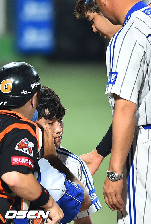 10일 오후 대구구장에서 열린 2014 한국야쿠르트 세븐 프로야구 삼성 라이온스와 롯데 자이언츠의 경기, 6회말 1사 1루 삼성 박해민이 롯데 장원준의 투구에 맞고 쓰러졌다. 장원준이 퇴장당하며 박해민에게 사과를 하고 있다.