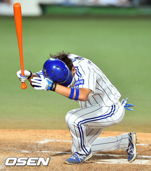 10일 오후 대구구장에서 열린 2014 한국야쿠르트 세븐 프로야구 삼성 라이온스와 롯데 자이언츠의 경기, 6회말 1사 1루 삼성 박해민이 롯데 장원준의 투구에 맞고 쓰러지고 있다.