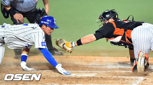 10일 오후 대구구장에서 열린 2014 한국야쿠르트 세븐 프로야구 삼성 라이온스와 롯데 자이언츠의 경기, 7회말 1사 3루 삼성 박한이의 외야플라이때 3루 주자 김상수가 롯데 강민호 포수에게 태그아웃되고 있다.