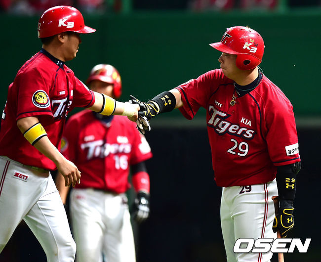 10일 오후 인천 문학구장에서 열린 '2014 한국야쿠르트 세븐 프로야구' SK 와이번스와 KIA 타이거즈의 경기 7회초 1사 만루 이범호의 2타점 적시타에 홈을 밟은 3루주자 이성우와 나지완이 하이파이브를 하고 있다.