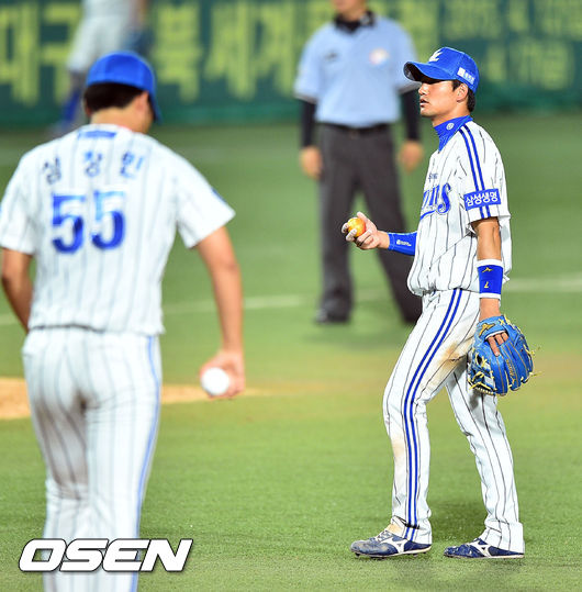 10일 오후 대구구장에서 열린 2014 한국야쿠르트 세븐 프로야구 삼성 라이온스와 롯데 자이언츠의 경기, 9회말 그라운드로 날아든 자두를 삼성 김상수가 볼보이에게 전달하고 있다.