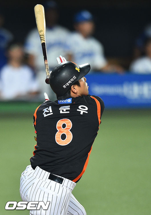10일 오후 대구구장에서 열린 2014 한국야쿠르트 세븐 프로야구 삼성 라이온스와 롯데 자이언츠의 경기, 9회말 1사 1,2루 롯데 전준우가 역전 3점 홈런을 날리고 있다