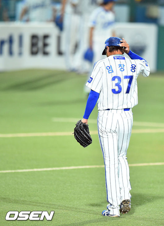 10일 오후 대구구장에서 열린 2014 한국야쿠르트 세븐 프로야구 삼성 라이온스와 롯데 자이언츠의 경기, 9회말 1사 1,2루 롯데 전준우에게 역전 3점 홈런을 허용한 삼성 임창용 투수가 아쉬워하고 있다