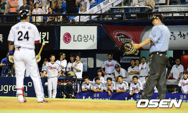 9회말 1사 3루에서 대타로 나선 LG 정의윤이 삼진으로 물러나자 더그아웃의 동료선수들이 아쉬워하고 있다./ jpnews@osen.co.kr
