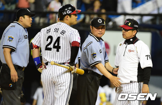 9회말 1사 3루에서 대타로 나선 LG 정의윤이 삼진을 당하자 양상문 감독이 그라운드로 나와 김정국 구심에 불만을 나타내고 있다./ jpnews@osen.co.kr