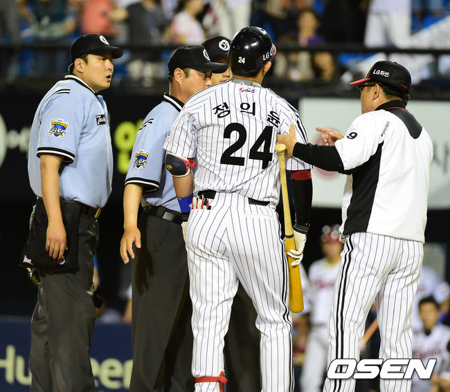 9회말 1사 3루에서 대타로 나선 LG 정의윤이 삼진을 당하자 양상문 감독이 그라운드로 나와 김정국 구심에 불만을 나타내고 있다./ jpnews@osen.co.kr