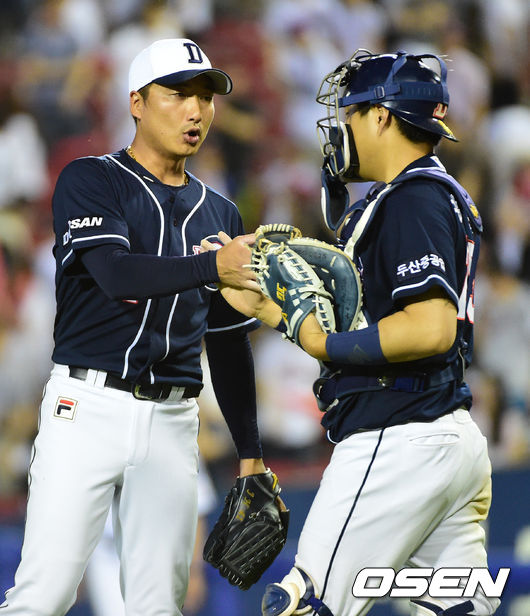 경기후 두산 정재훈과 양의지가 승리 하이파이브를 하고 있다./ jpnews@osen.co.kr